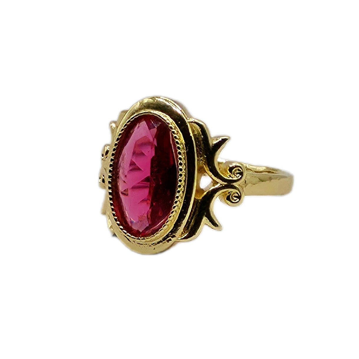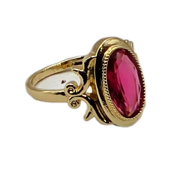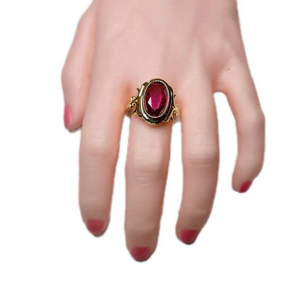 Markanter Ring aus Kupfer, vergoldet im Vintage-Stil (um 2022). Im Zentrum sitzt ein rubinroter synthetischer Zirkonia mit kräftiger Farbwirkung. Der Ring zeigt minimale Tragespuren, insgesamt gepflegt und gut tragbar.
