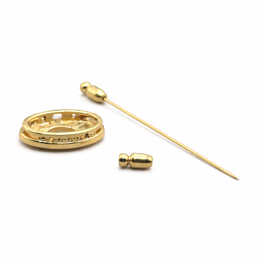 Ich präsentiere Ihnen eine Vintage Tuchnadel von Pierre Lang – eine Reversnadel mit ovalem Charm-Anhänger. Der Anhänger ist mittig durchbrochen und mit Zirkonia besetzt. Durch die versetzten Einstellösen an beiden Seiten lässt sich der Anhänger flexibel positionieren. Auf der Rückseite ist „PL“ graviert.