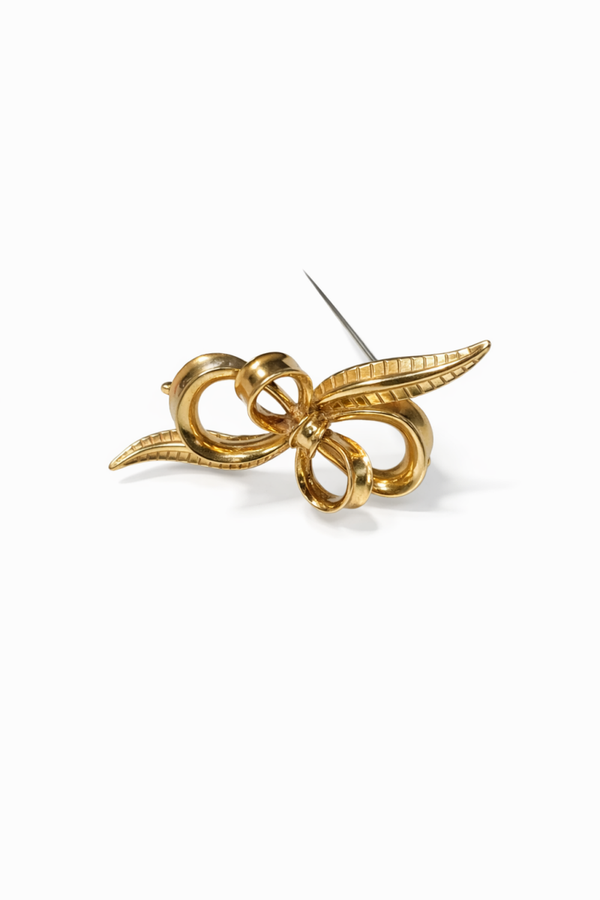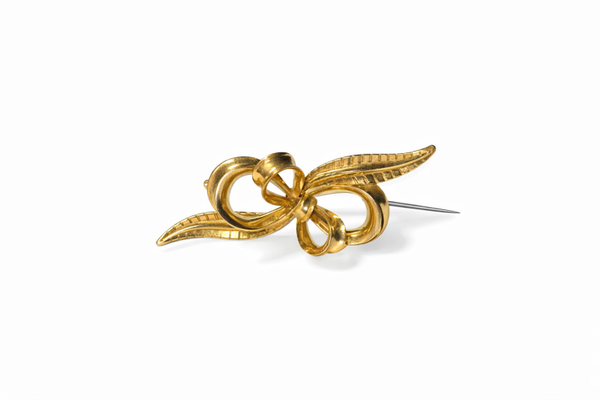 Diese Brosche bringt genau den klassischen Jugendstil-Charme mit: eine florale Schleifenform, harmonische Linien und ein eleganter Goldton. Das Stück stammt aus einem Firmennachlass und ist ungetragen – entsprechend wirkt die Oberfläche frisch und sauber, ohne Trageabrieb.