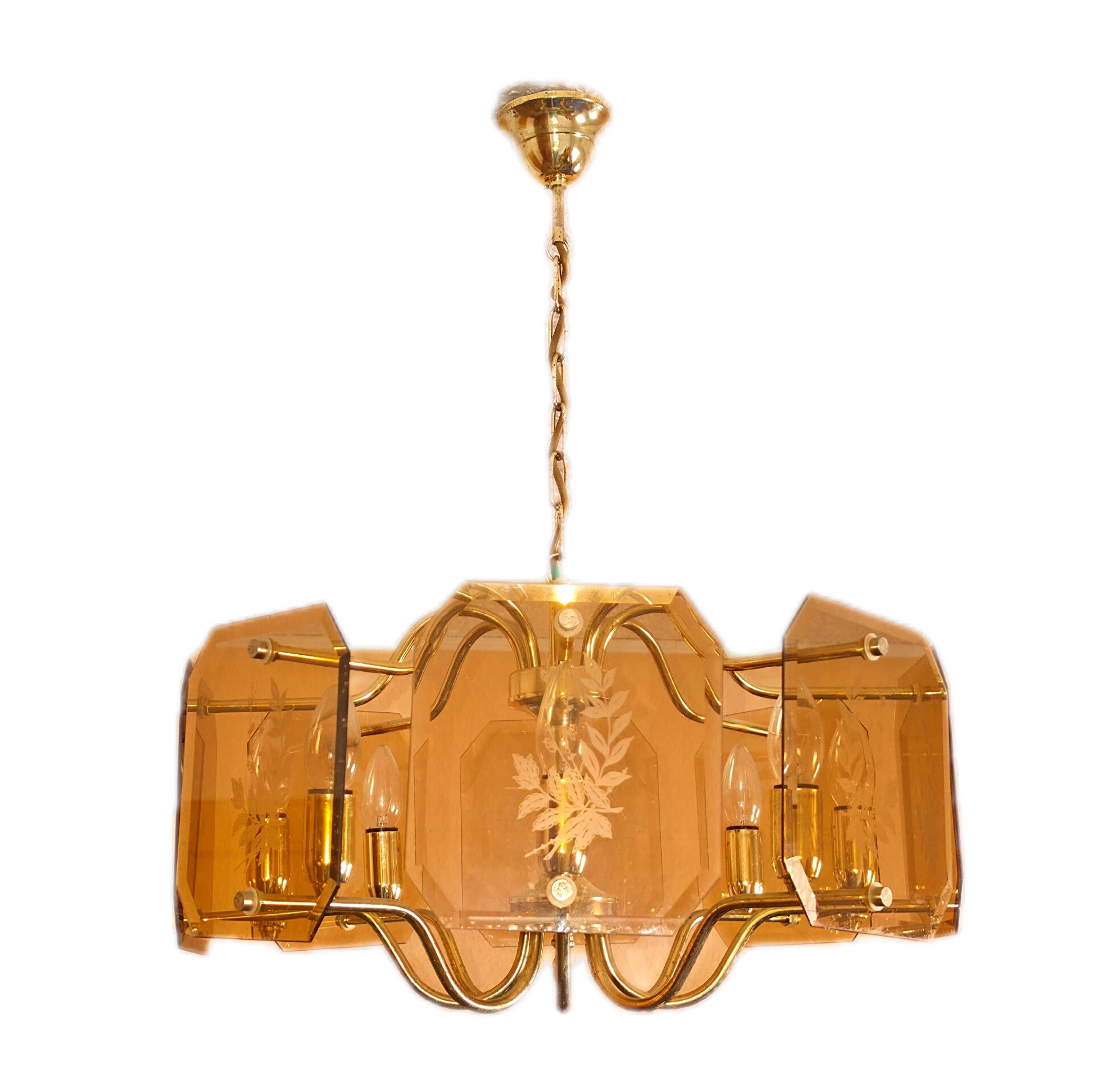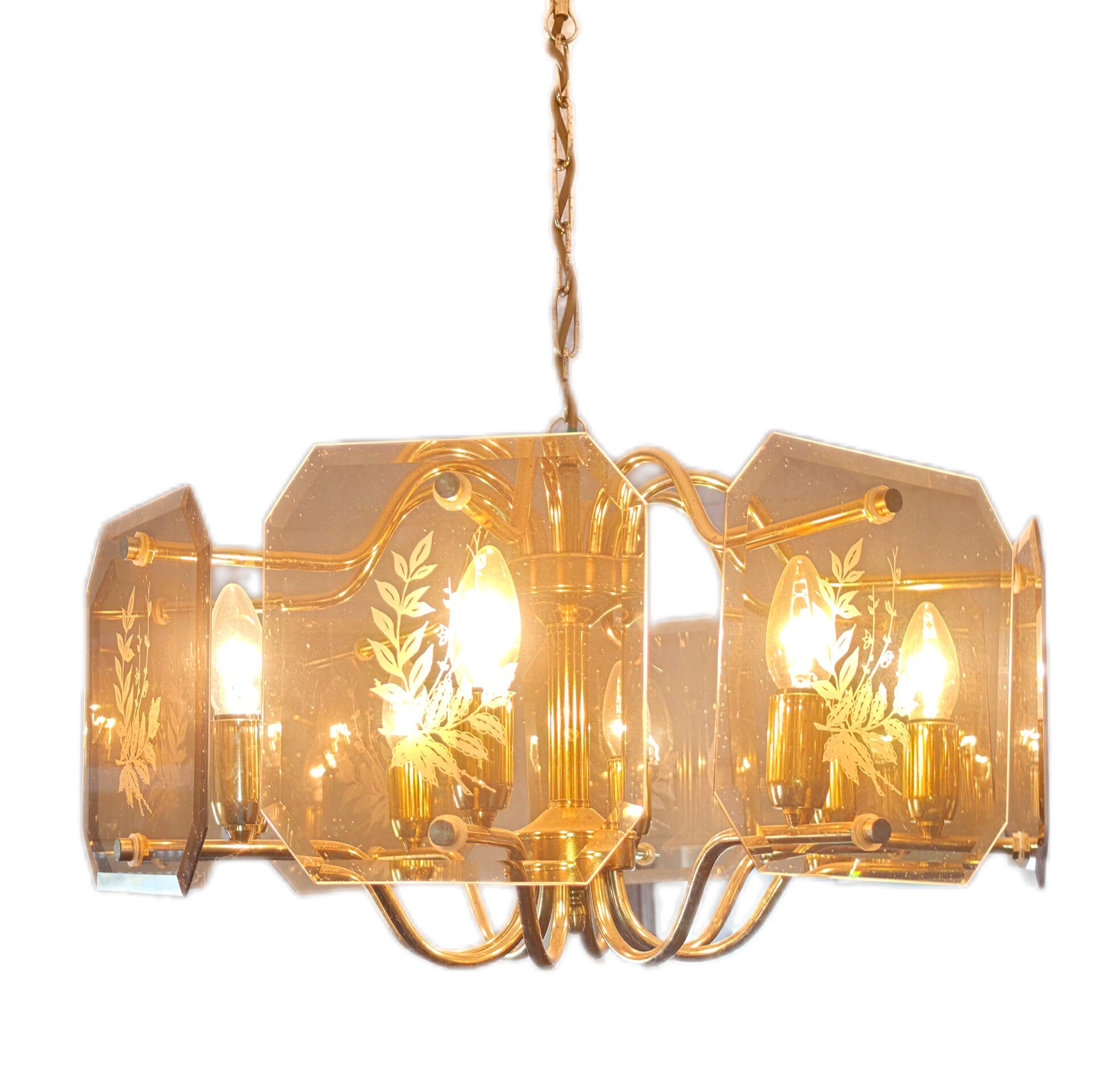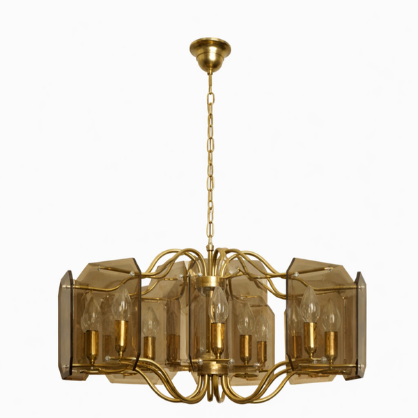 Vintage Kronleuchter 8-flammig hängend – Messing mit Patina, für Kerzenbirnen
