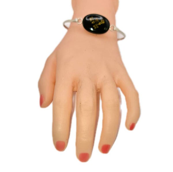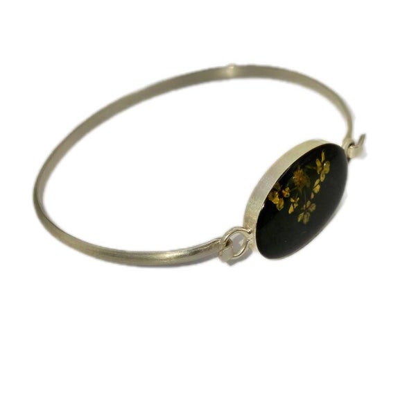 Massiver Armreif aus geprüftem 925er Sterlingsilber, ohne sichtbare Punze. Das Design mit querovalem schwarzem Bernstein und floralem Gold-Gelb-Motiv ist in ähnlicher Form mehrfach bekannt und wird der Art-Déco-Epoche bzw. dem Art-Déco-Stil zugeordnet.