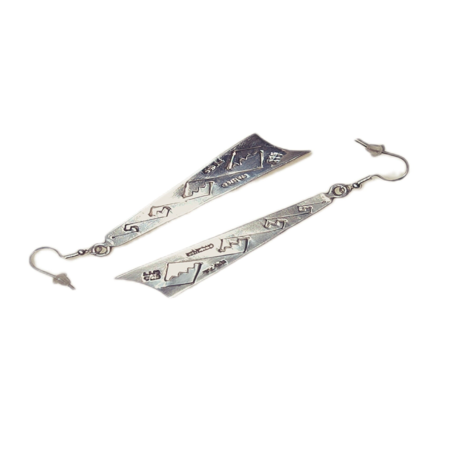 Zum Verkauf steht ein markantes Paar Vintage-Ohrhänger aus massivem 925er Sterling Silber, gefertigt im Jahr 1971 von einem registrierten Silberschmied aus Taxco, Mexiko (Punziert mit TM-1 925). Die Ohrringe bestechen durch ihr kantiges Cut-out-Muster in röhrenartiger, leicht skulpturaler Form – massiv gearbeitet und mit spürbarem Southwestern-Vibe.