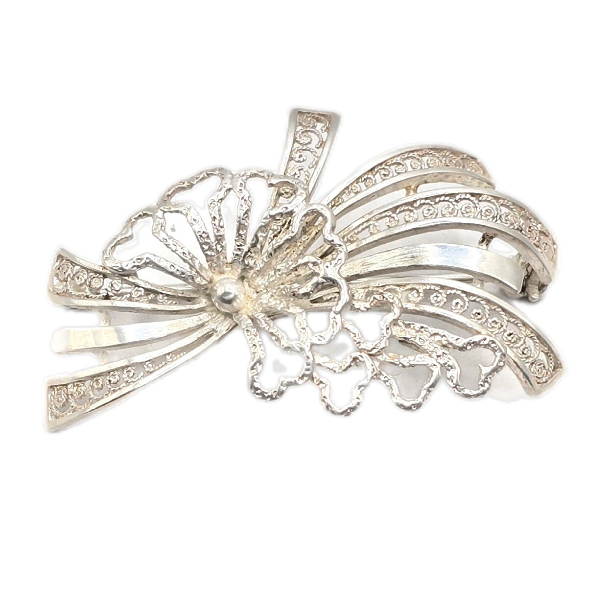 Filigrane Silberbrosche aus 800er Silber mit romantischem Herz- und Schleifenmotiv. Das Design wirkt fein, dekorativ und klassisch elegant. Gerade durch die durchbrochene Gestaltung und die zarte Linienführung entsteht eine schöne, leichte Optik mit Vintage-Charme.