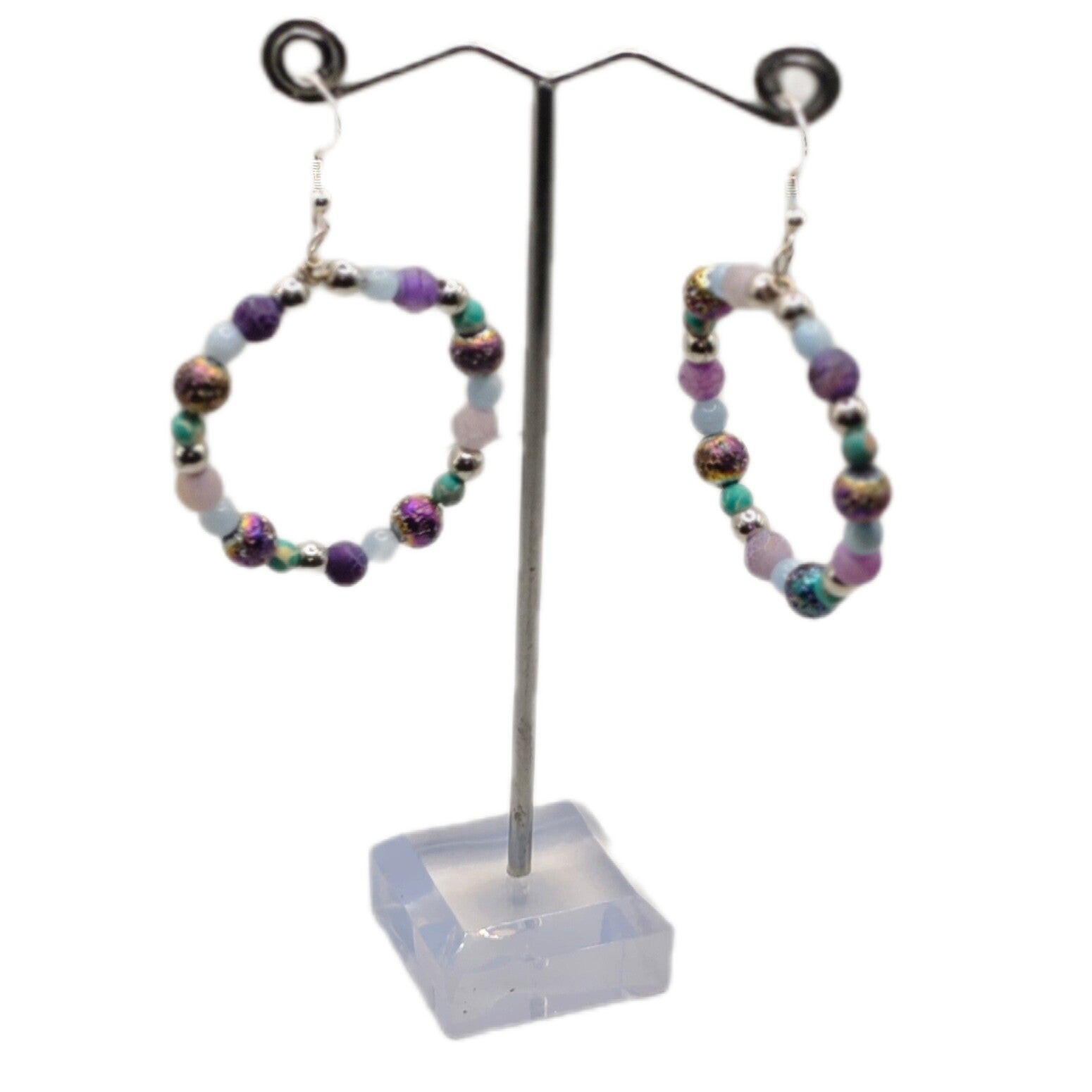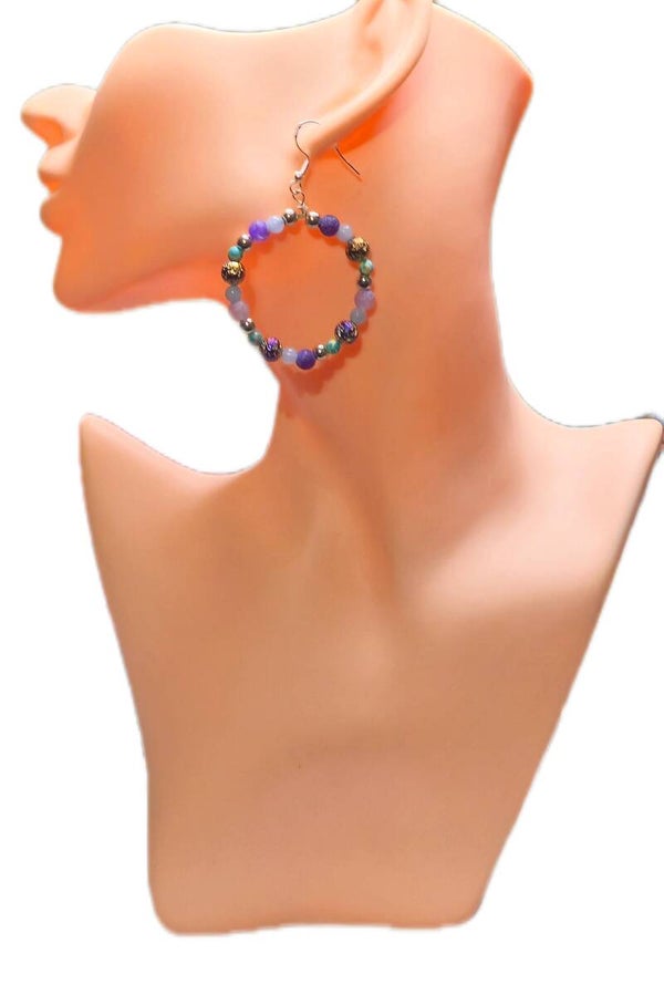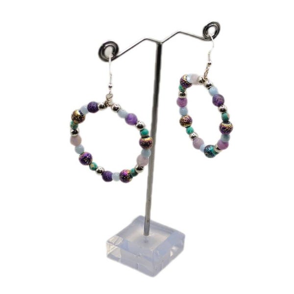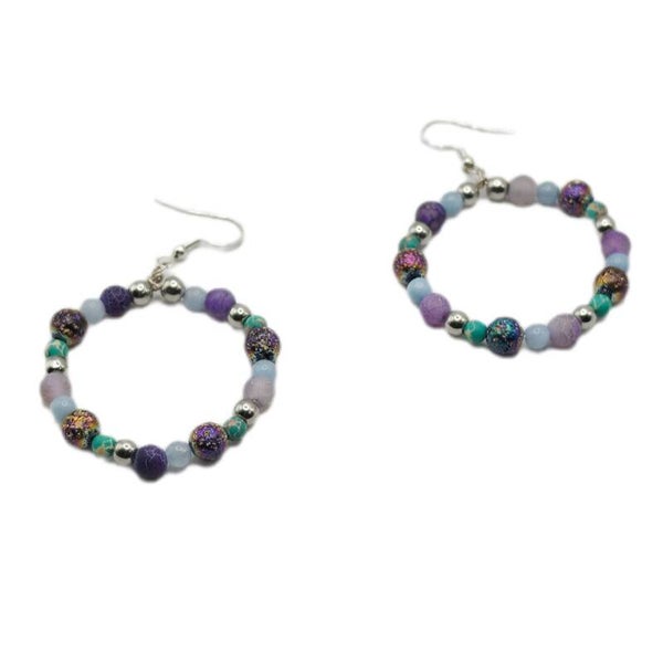 Ausdrucksstarke runde Ohrhänger aus 925 Sterlingsilber mit einer lebendigen Mischung aus Amethyst (hell- und dunkelviolett), Türkis und Aquamarin. Dazwischen setzen Silberperlen und schimmernde Rainbow-Metallperlen feine Akzente. Durch die runde Form wirken die Ohrringe modern, leicht verspielt und trotzdem hochwertig – ein echter Hingucker, besonders zu schlichten Outfits.