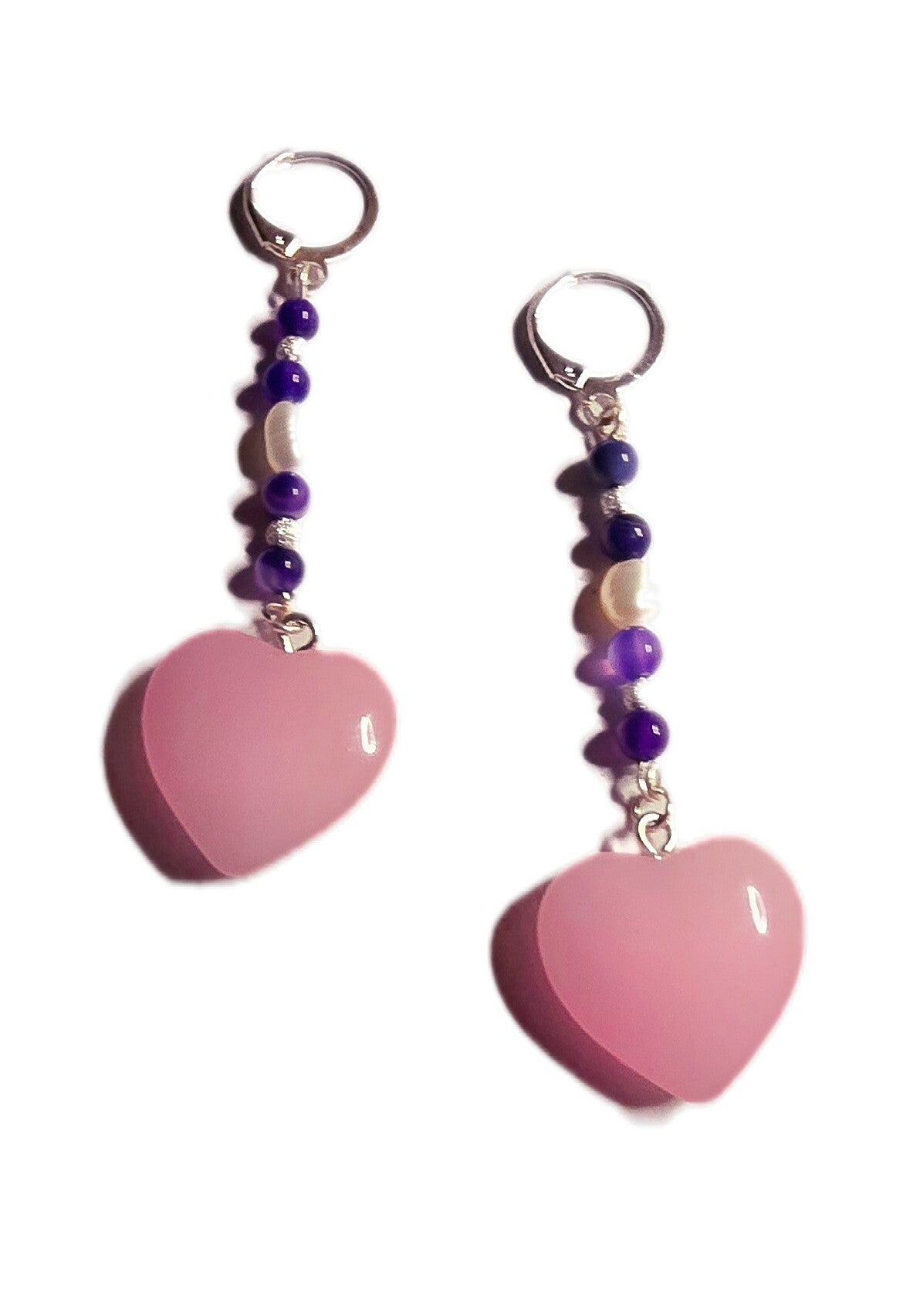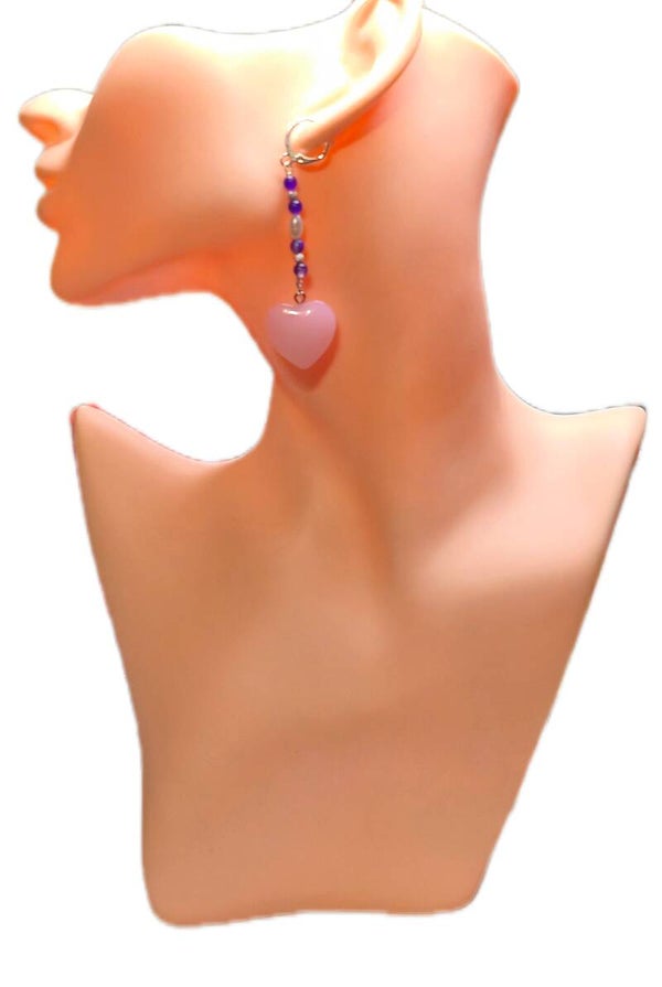 Zarte, aber trotzdem auffällige Ohrhänger aus 925 Sterling Silber mit Amethyst-Perlen, feinen Süßwasserperlen und kleinen Silberperlen. Highlight ist das sanft rosafarbene Rosenquarz-Herz, das am Ende frei schwingt und dem Design diesen klassischen, romantischen Touch gibt – clean, edel, tragbar.