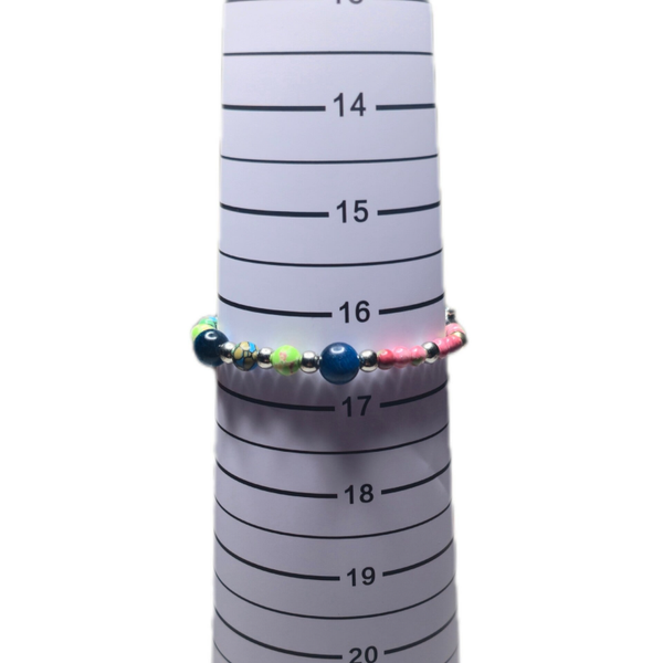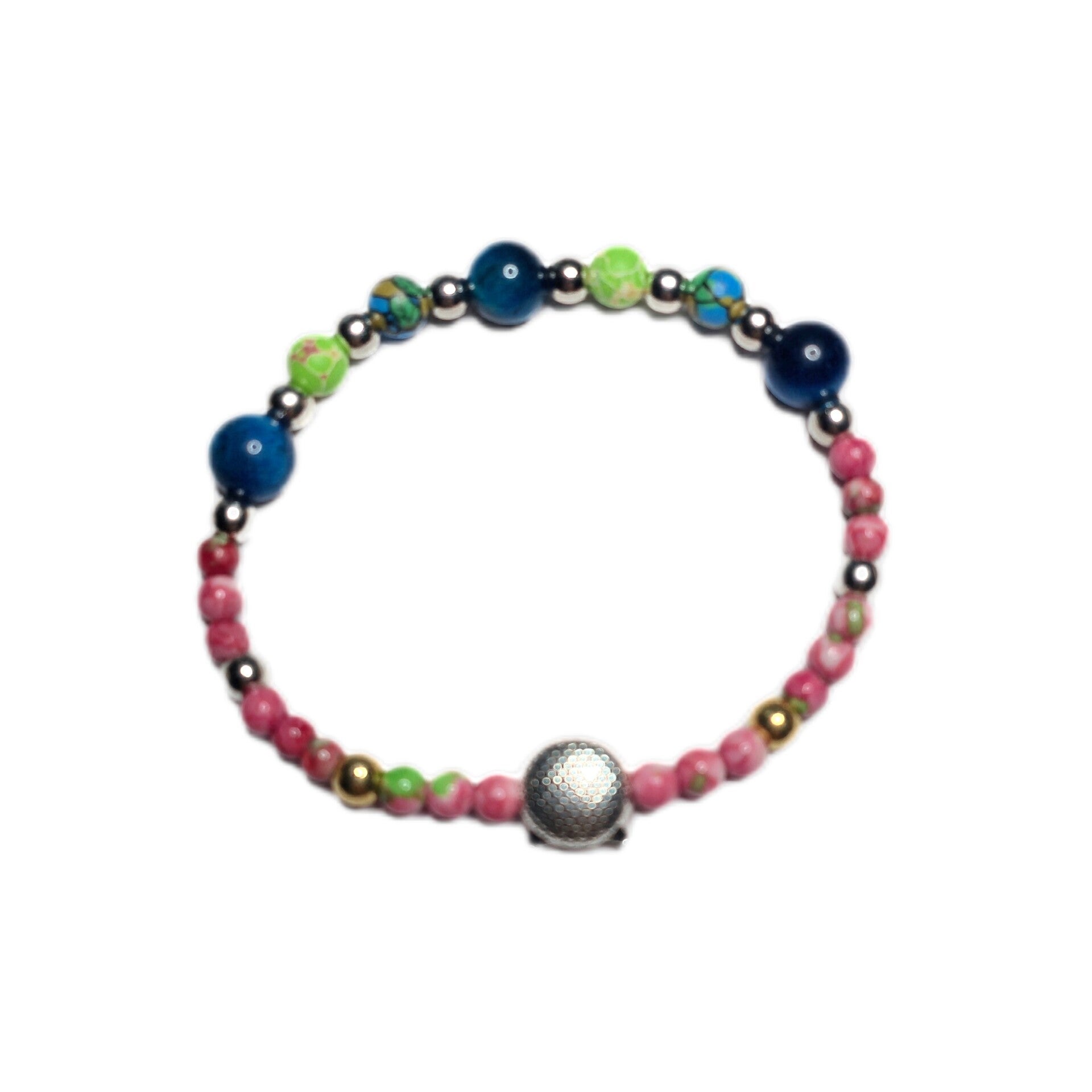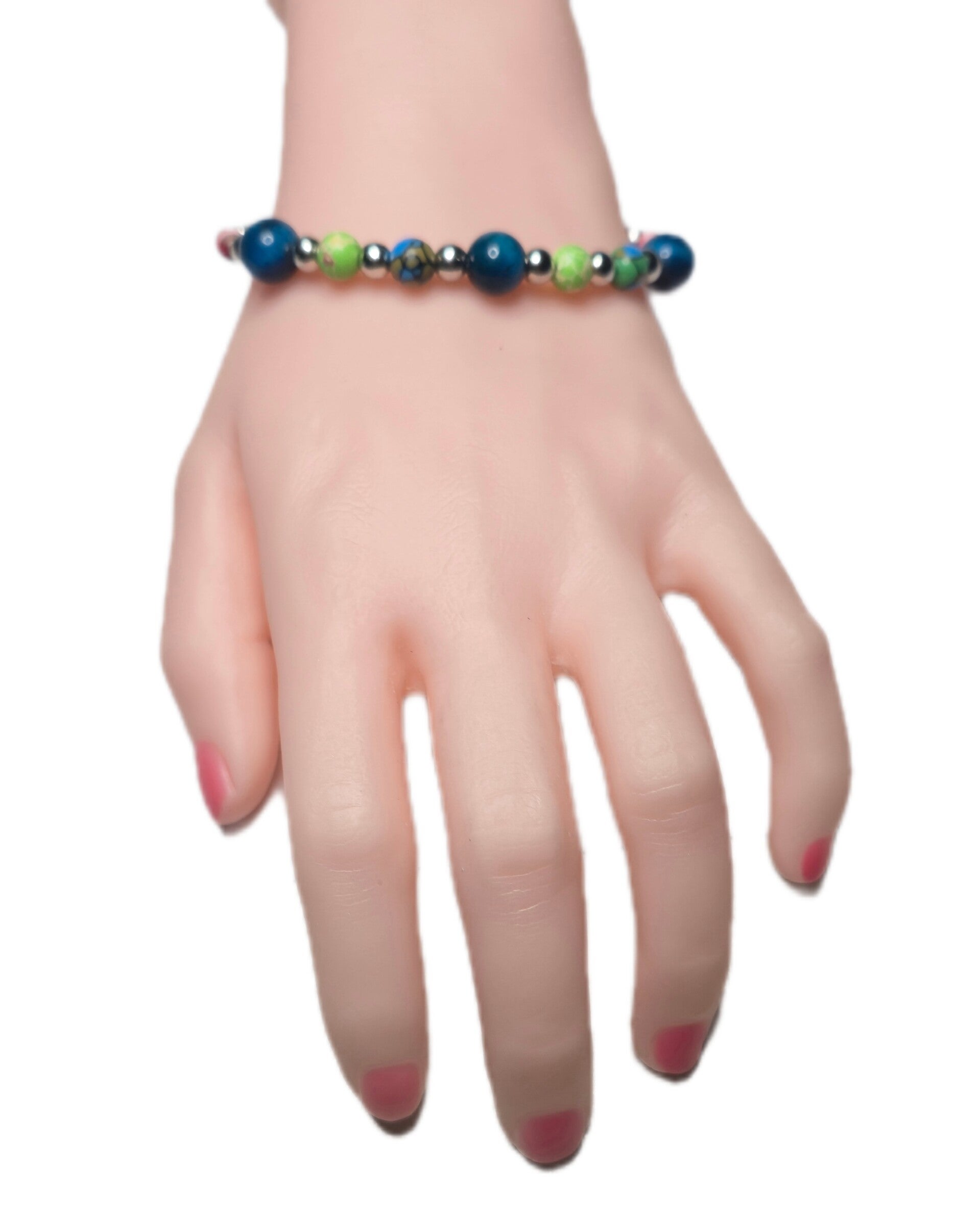 Neues Naturstein-Armband auf Gummi gefädelt mit dekorativem Eulen-Element, silberfarbenen Perlen und goldfarbenen Akzenten am Ende. Verarbeitet sind 25 Natursteine in verschiedenen Größen (ca. 3, 5 und 7 mm), darunter Jaspis in Hellgrün und Rosa, Tang Tri in Blau-Beige sowie blaues Tigerauge.