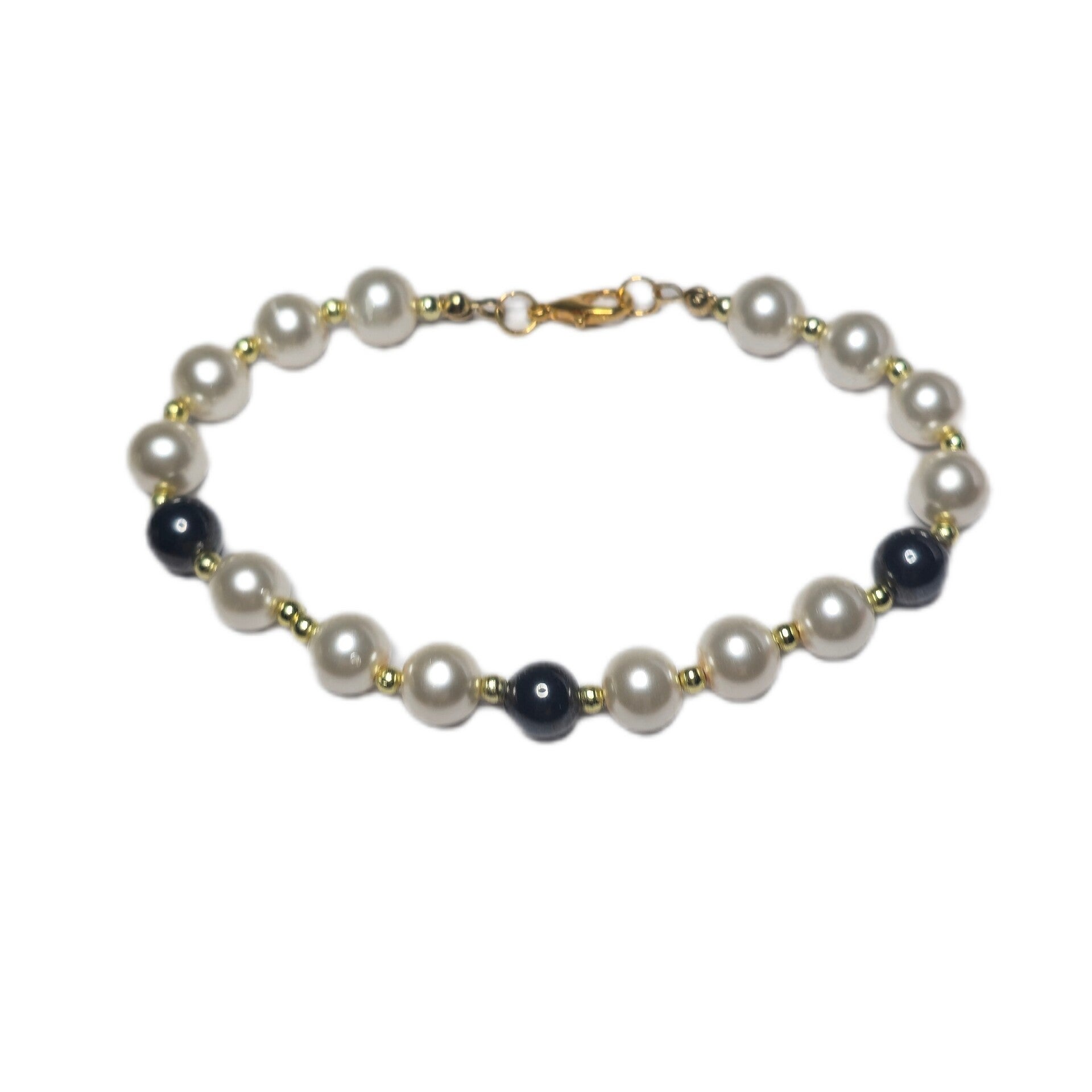 Die Kombination aus cremeweißen Perlen, dunklem Hämatit und goldfarbenen Akzenten wirkt klassisch und edel.