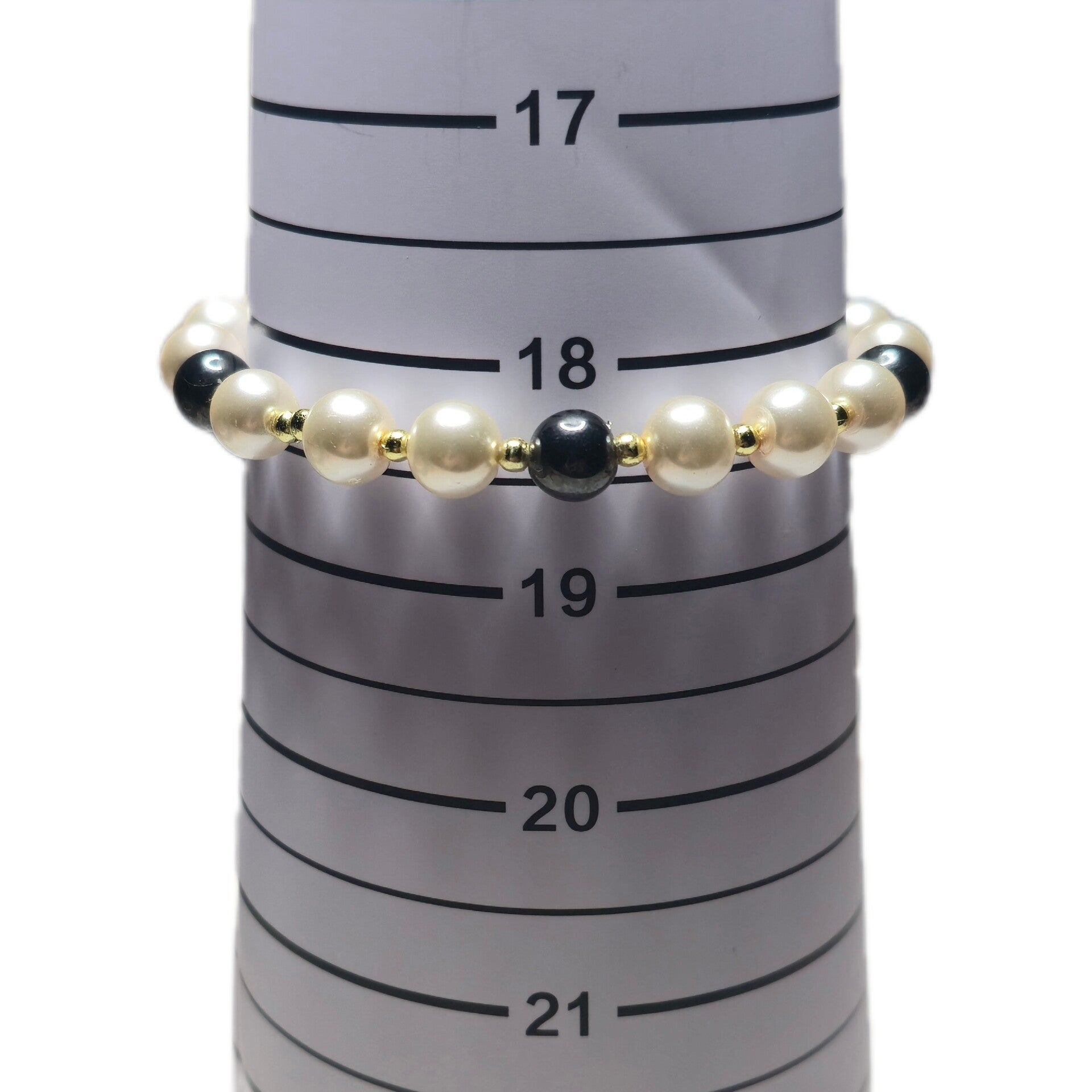 Elegantes Perlenarmband mit Muschelkernperlen, magnetischem Hämatit und goldfarbenen Perlen als Zwischenelemente.