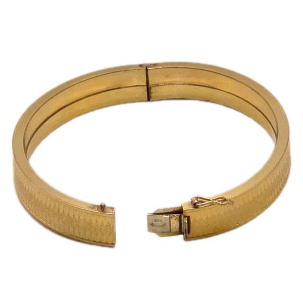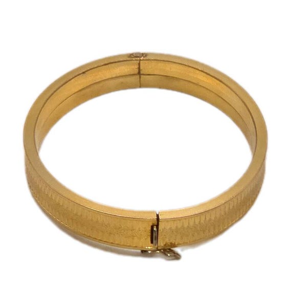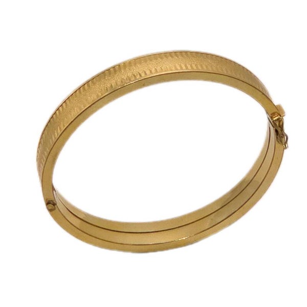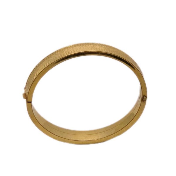 Die fein gerippte, reliefartige Oberfläche fängt das Licht schön ein und verleiht dem Armreif einen warmen Goldschimmer. Durch die ovale Form sitzt er angenehm am Handgelenk. Der Steckverschluss mit Sicherheitsacht sorgt für guten Halt und angenehmen Tragekomfort.