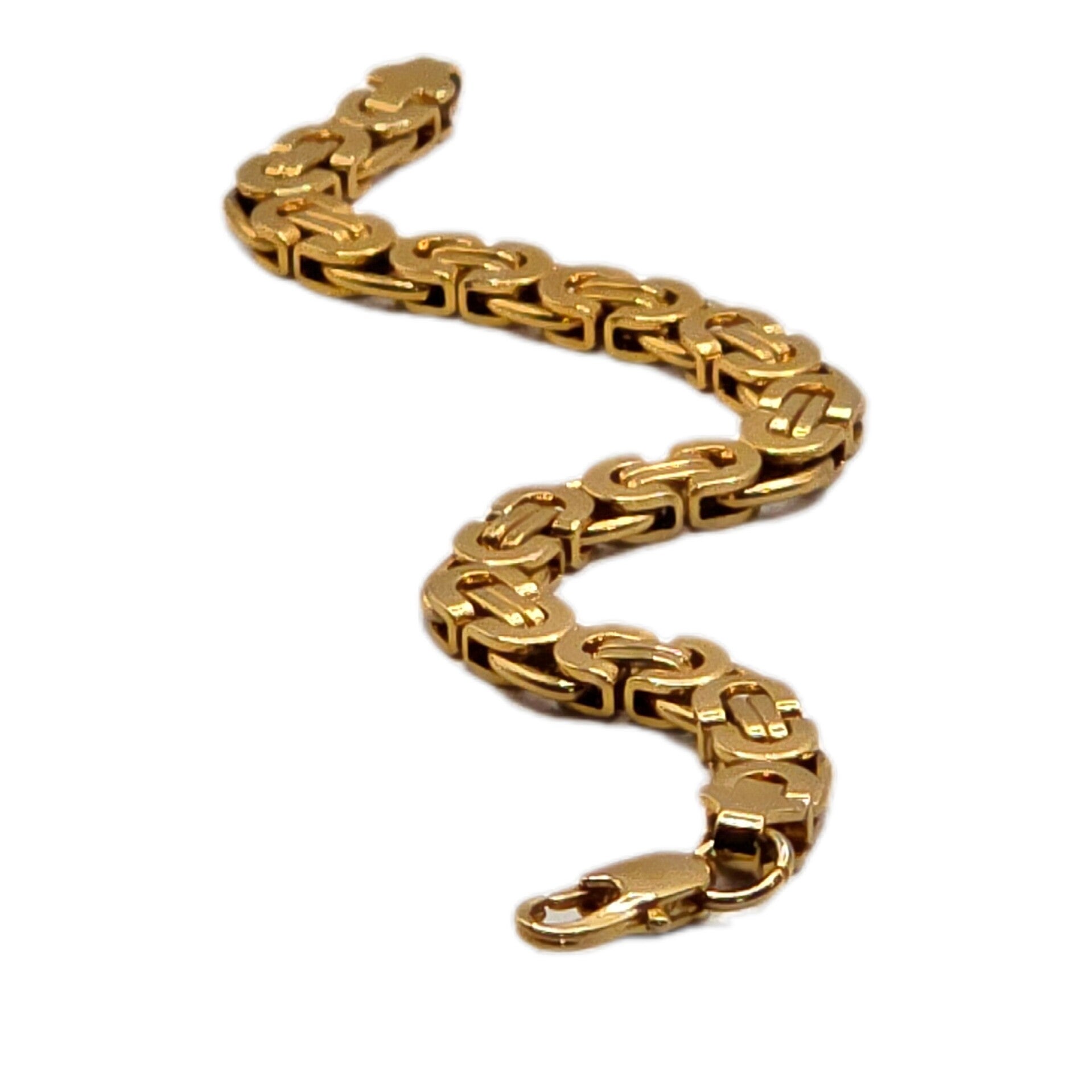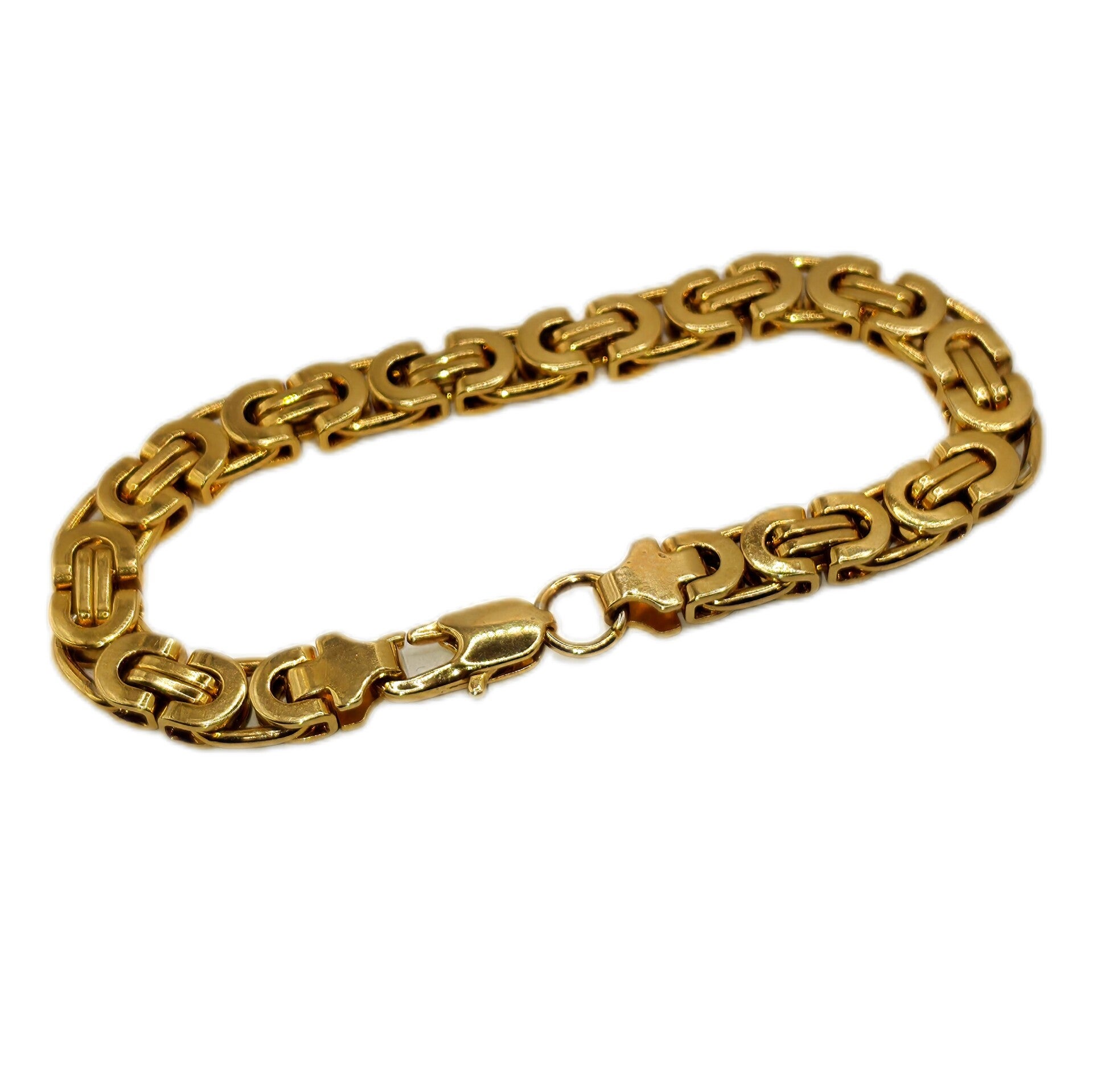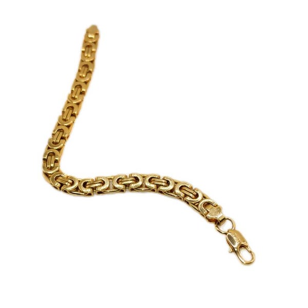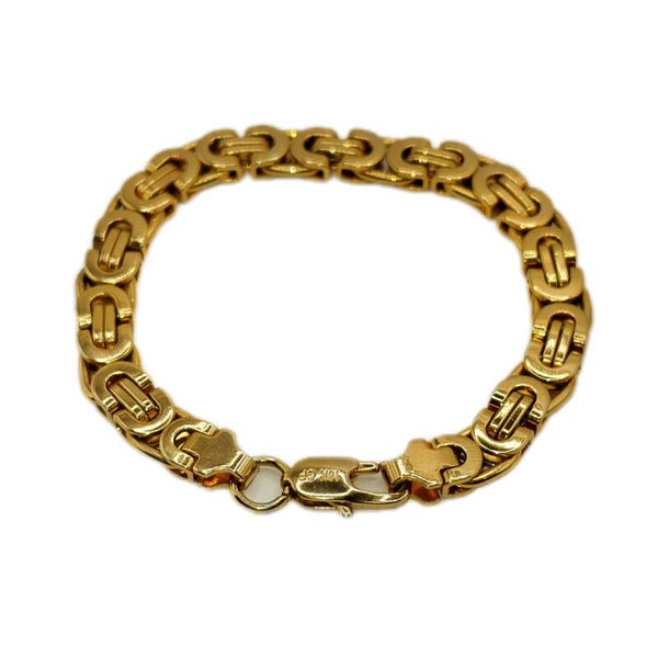Dieses breite Königsarmband überzeugt durch seine klassische, solide Verarbeitung und das markante Flechtmuster. Die eng gearbeiteten Glieder sorgen für eine hochwertige, kompakte Optik und ein angenehm wertiges Tragegefühl. Dank der 18K-Vergoldung (GF-Markierung) schimmert das Armband in einem warmen Goldton und ist unisex vielseitig kombinierbar – als elegantes Statement solo oder harmonisch zu Uhr und Ring.