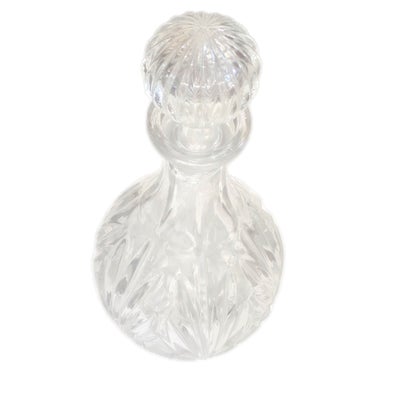 Handgeschliffene Karaffe aus Bleikristall in weiß mit bauchiger Form und dekorativem Schliff. Ein elegantes Vintage-Stück mit schöner Lichtwirkung und klassischer Ausstrahlung. Der originale Verschluss ist nicht mehr vorhanden, wurde jedoch durch einen gut passenden Glasstopfen ersetzt. Dadurch bleibt die Karaffe weiterhin dekorativ und funktional nutzbar. Ideal für Sammler, Liebhaber von Kristallglas oder als stilvolles Einzelstück für Vitrine, Bar oder gedeckten Tisch.